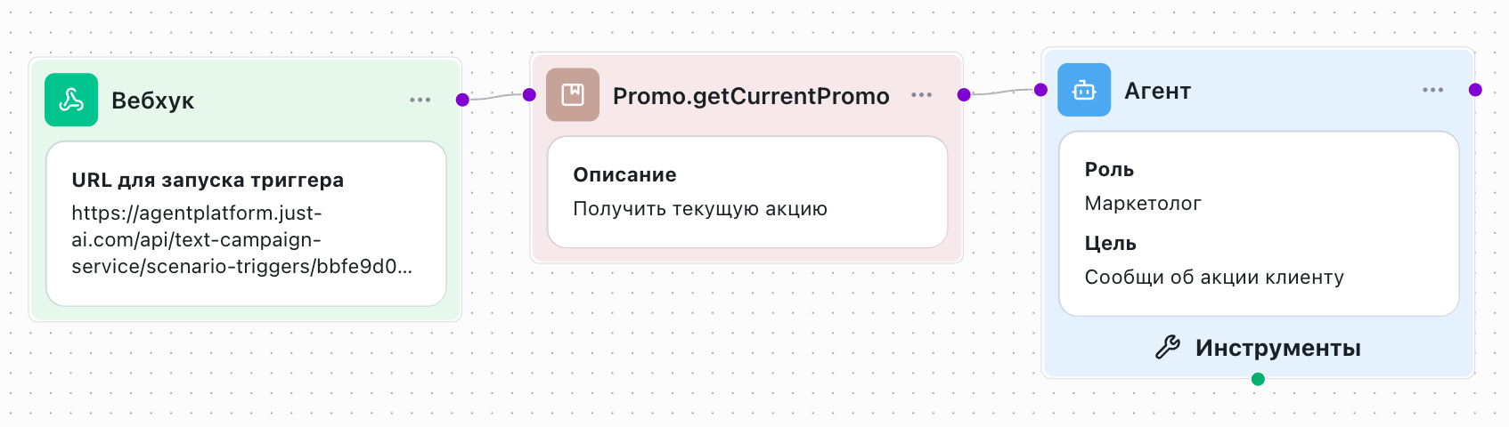 Условия новой акции: {{ Context.getLastFunctionResult() }}.предупреждениеНастройка игнорируется в режиме диалога. Если вам нужно обработать, например, триггер Вебхук и затем поддержать диалог, используйте двух агентов: первый среагирует на вебхук, а второй — ответит на сообщения пользователя.