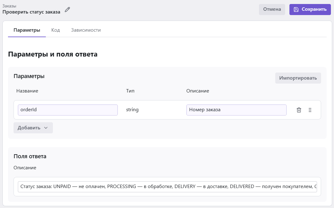• Описание ответа: помогает AI-агенту правильно интерпретировать результат работы функции.