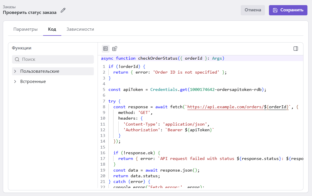 На вкладке Код напишите тело функции на JavaScript. Встроенный редактор поддерживает подсветку синтаксиса, автодополнение, подсказки при наведении на функцию и отображение ошибок.
