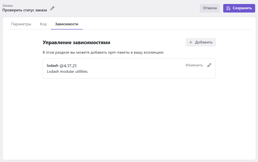Если для работы вашего кода требуются внешние npm-пакеты (например, axios или lodash), добавьте их на вкладке Зависимости.